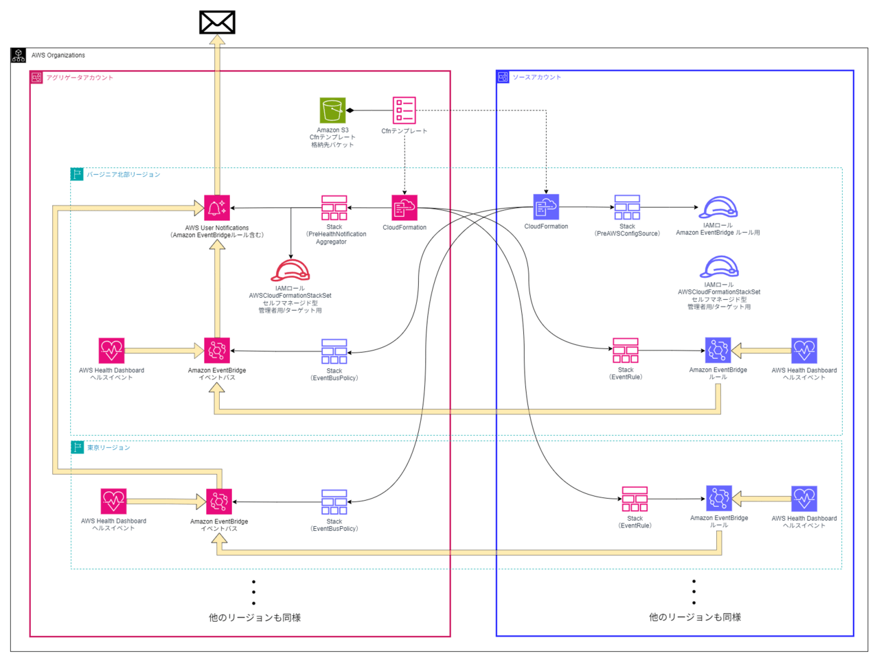 - AWS User Notifications 通知ハブはバージニア北部のみ設定されている状態を想定しています。もし、既に東京リージョンも設定されている状態の場合にはエラーになってしまいます。その場合には、東京リージョンを対象から外すか、Cfnテンプレートを修正してください。