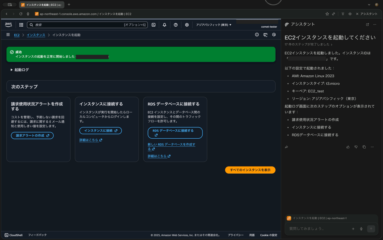 この結果から、AIブラウザは指示されたゴール(インスタンスの起動)を達成するための必須操作は自律的に実行できる能力を持つことがわかりました。一方で、インスタンス名のように、設定が任意である項目については、指示がなければ補完してくれません。