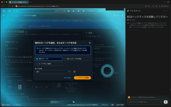 この指示を受け取ったCometは、すぐにAWSマネジメントコンソールの操作を開始しました。EC2のダッシュボードへ移動し、「インスタンスを起動」ボタンをクリック、AMIやインスタンスタイプの選択画面をスムーズに進んでいきます。