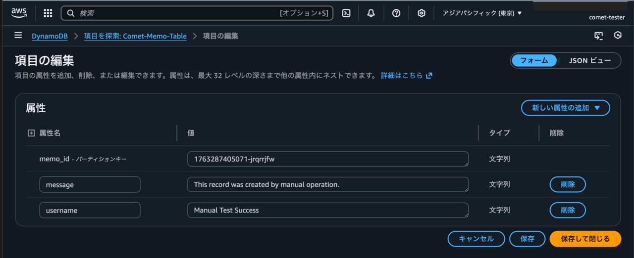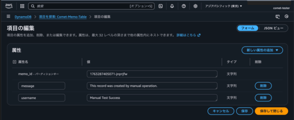 - これらの `memo_id`, `username`, `message` を、DynamoDBの「Comet-Memo-Table」に保存します。