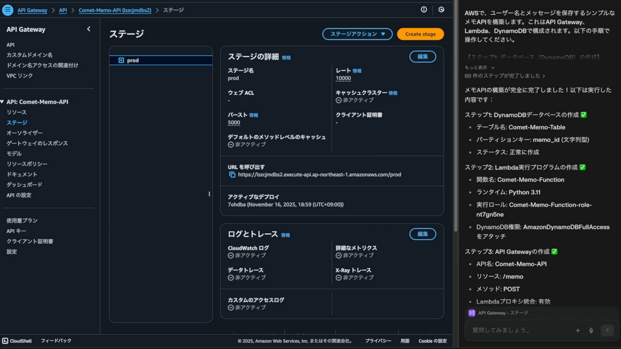 EC2インスタンスの作成に成功したことで、Cometが基本的なGUI操作をこなせることは確認できました。次に、より実践的なタスクとして、複数のサーバーレスサービスを連携させたAPIアーキテクチャをゼロから組むことに挑戦しました。