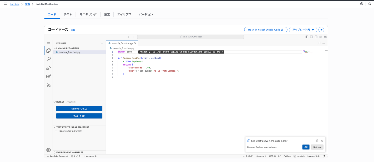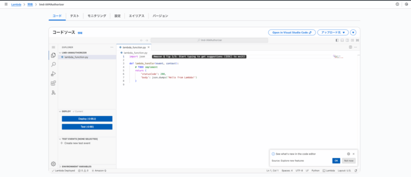 今回のAPI Gatewayの裏側にあるLambdaは、特に凝ったものにする必要がないので、デフォルトのソースコードそのままとします。
