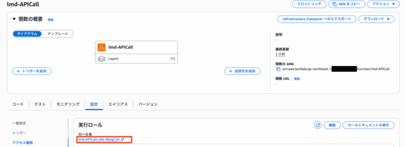 Lambdaの「設定」→「アクセス権限」からロール名をクリックします。