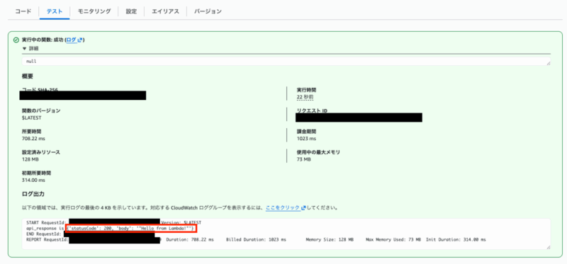 では、実際にLambdaのテストとして動作確認をしてみますと、ログ出力のところでAPIの裏側のLambdaとして実装したステータスコード200と「Hello from Lambda!」が出力されていることがわかります。