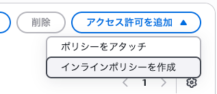 遷移したら、IAMRoleの画面が出るので、「アクセス許可を追加」→「インラインポリシーを作成」をクリックします。