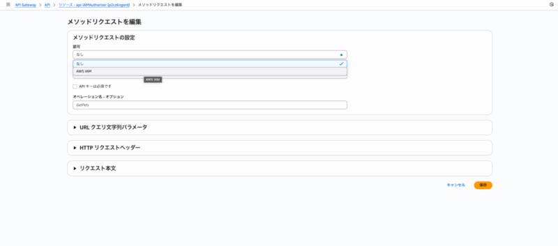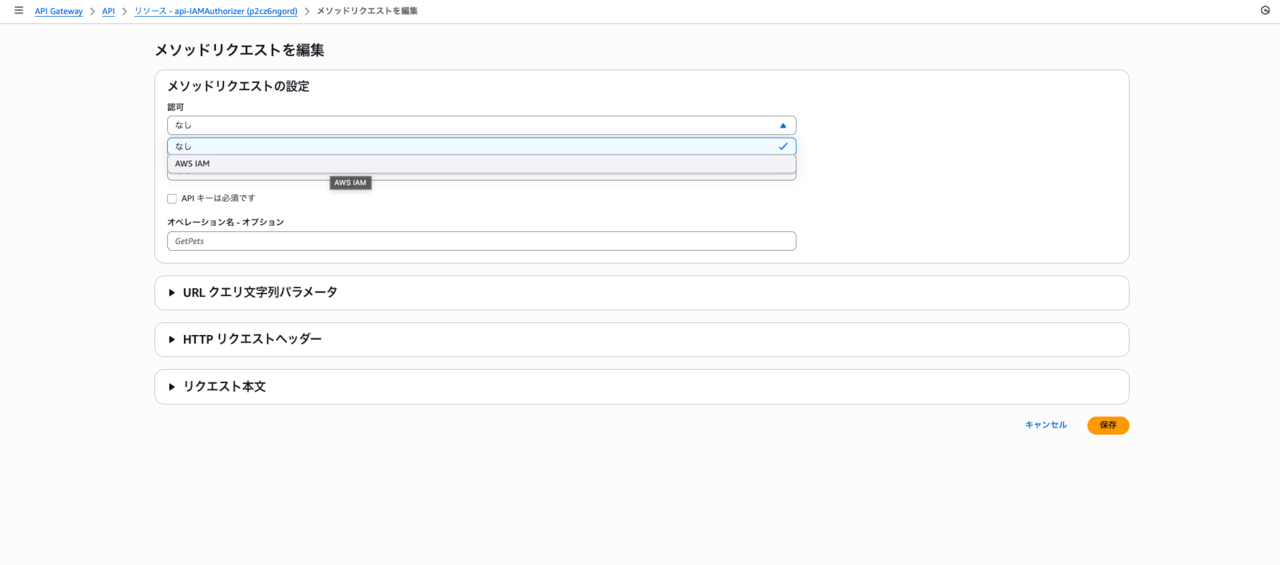 認可の部分で、AWS IAMをクリックして、保存します。