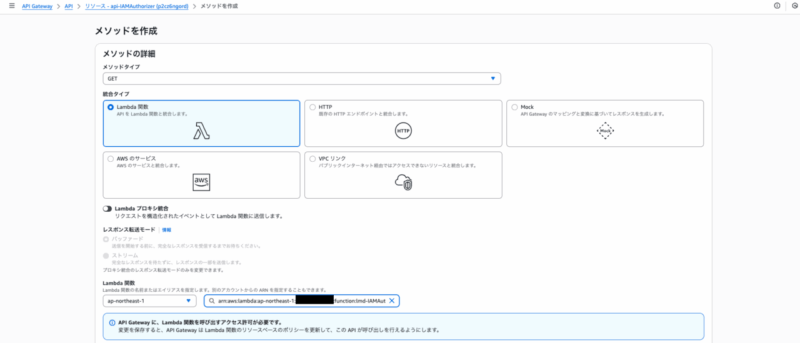メソッドの作成も行います。今回は呼び出しができれば良いのでGetにし、先ほど作成したLambda関数を設定します。