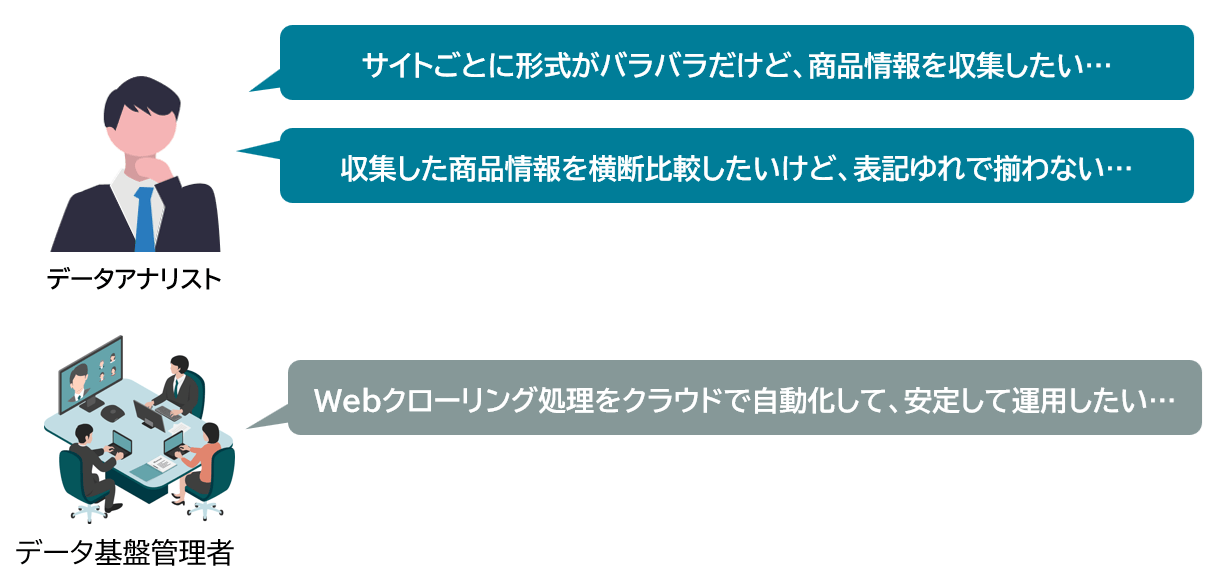 データ活用基盤において、外部サイトからの商品情報を収集し、分析や業務活用に利用したいというニーズがありました。特に、複数サイトに分散した商品情報を横断的に収集し、一覧化・比較可能な形で整理することが求められています。