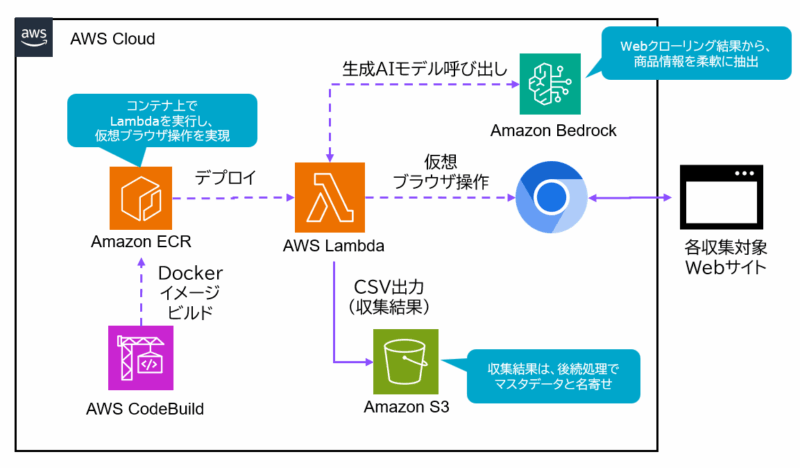 サイトごとに構造が異なるWebページから商品情報を収集するため、仮想ブラウザによるクローリング方式を採用しました。これにより、単純なHTTP取得では対応できない動的コンテンツやJavaScriptレンダリングにも対応可能としています。実行環境には、コンテナイメージを利用可能なAWS Lambdaを採用し、特定端末に依存しないクラウド上での実行基盤を構築しました。