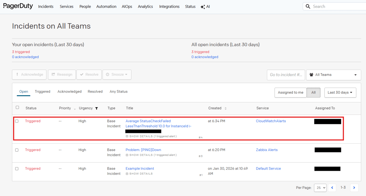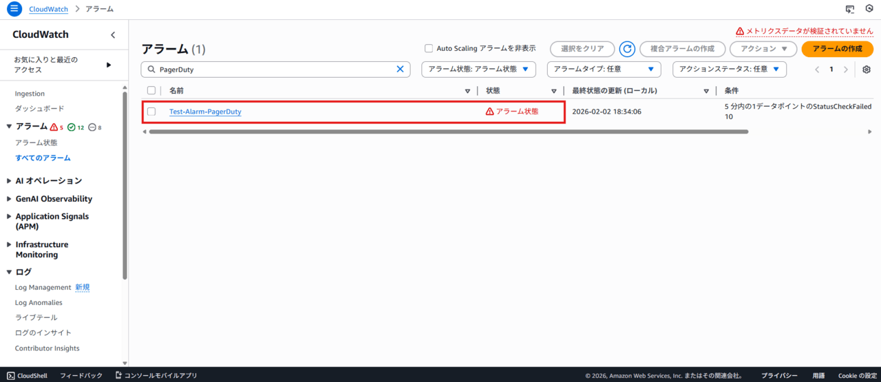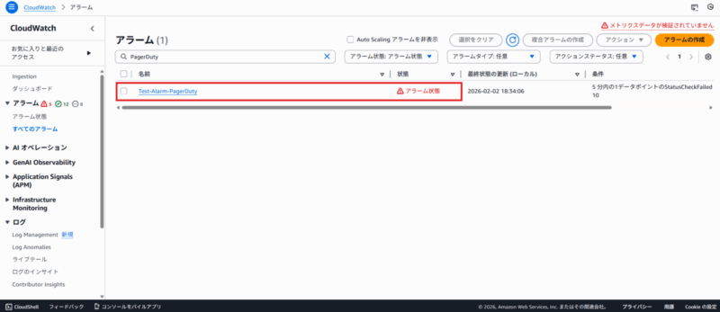 CloudWatchアラームが「アラーム状態」になると、PagerDuty上でインシデントが Triggered状態になることを確認できました。