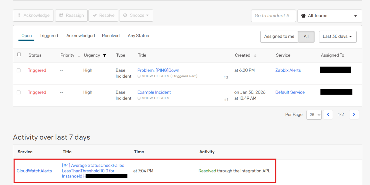 すると、PagerDutyのアクティビティログに “Resolved through the integration API” と表示され、インシデントステータスが自動的に Resolved(解決済み) に変わることを確認しました