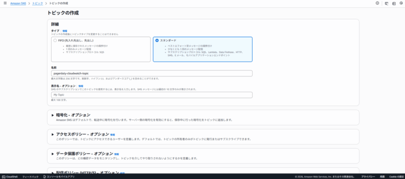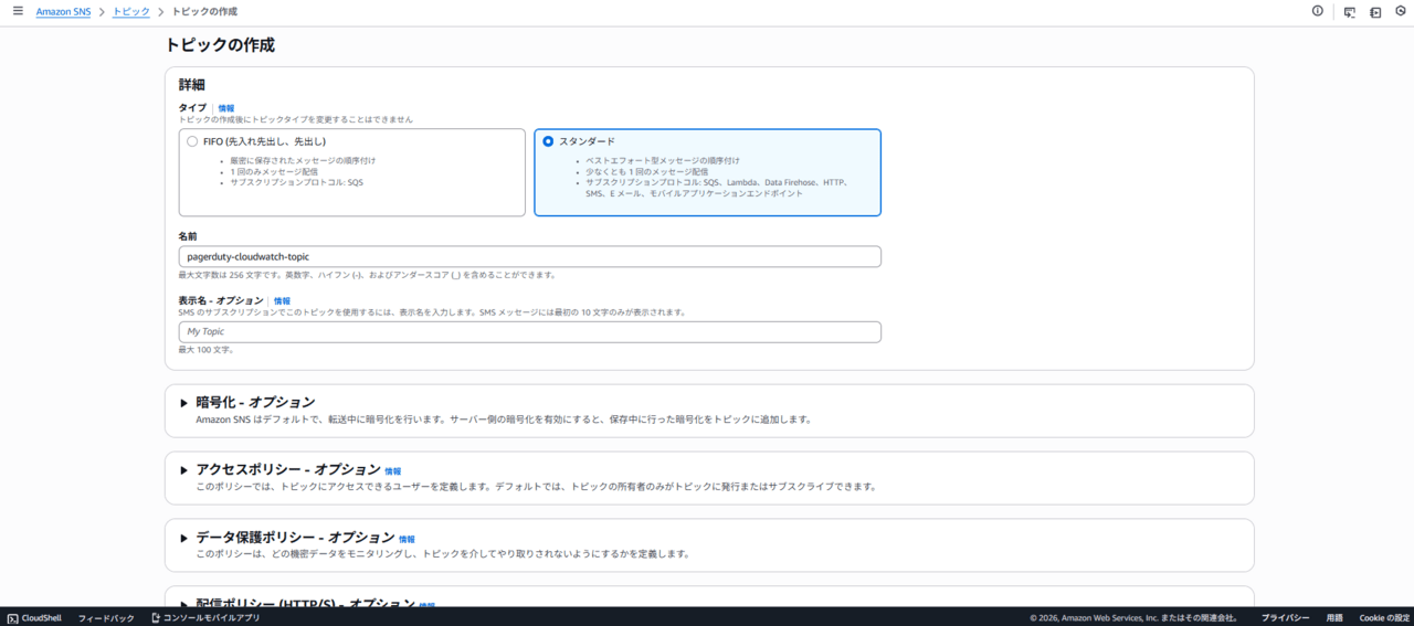 タイプは スタンダードを選択し、名前(例: pagerduty-cloudwatch-topic)を入力してトピックを作成します。
