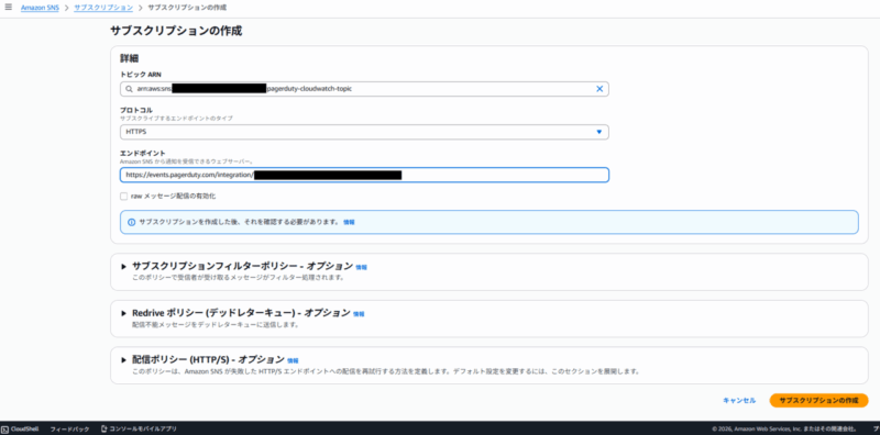 SNSトピックの選択: ①と同じ pagerduty-cloudwatch-topic を選択