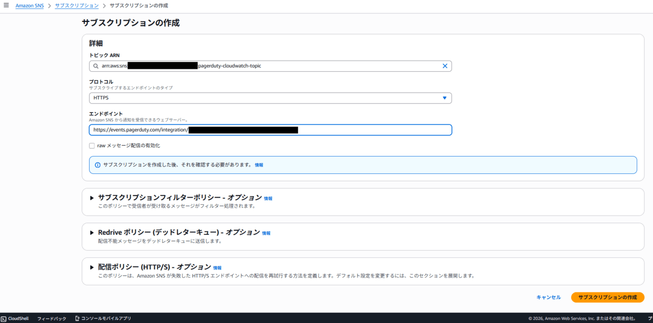作成したトピックの画面で [サブスクリプションの作成] をクリックします。以下の通り設定し、作成します。