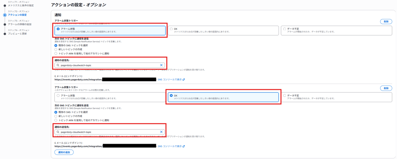 CloudWatchのアラーム作成(または編集)画面の「アクションの設定」にて、以下の2つの通知を設定します。