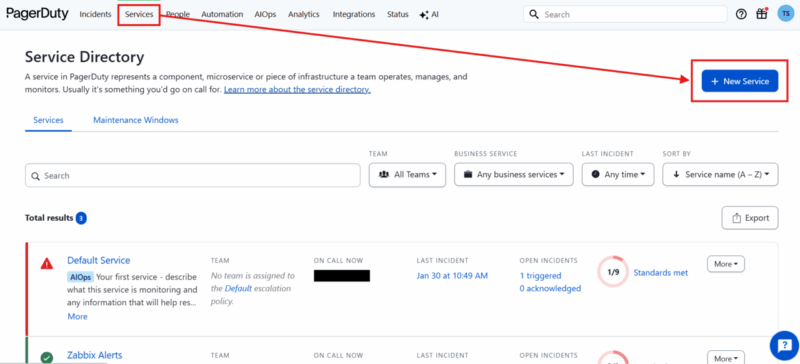PagerDutyのメニューから [Services] > [Service Directory] を開き、[+ New Service] をクリックします。