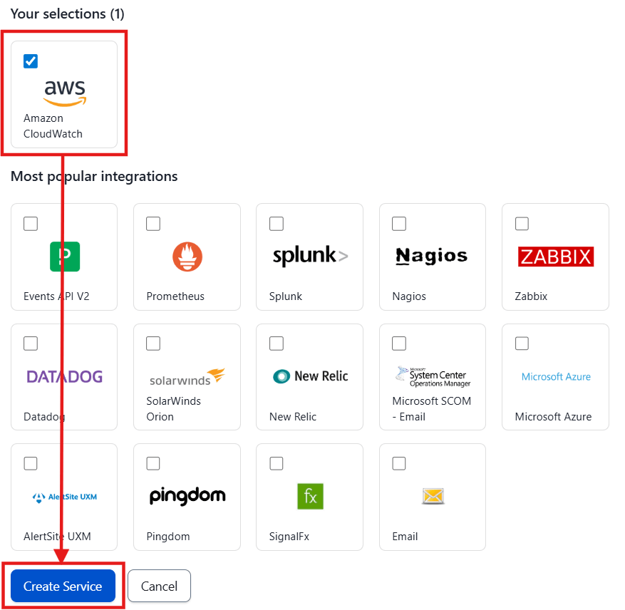 Serviceの名称(例: CloudWatchAlerts)などを入力し、Integrationの設定画面まで進みます。