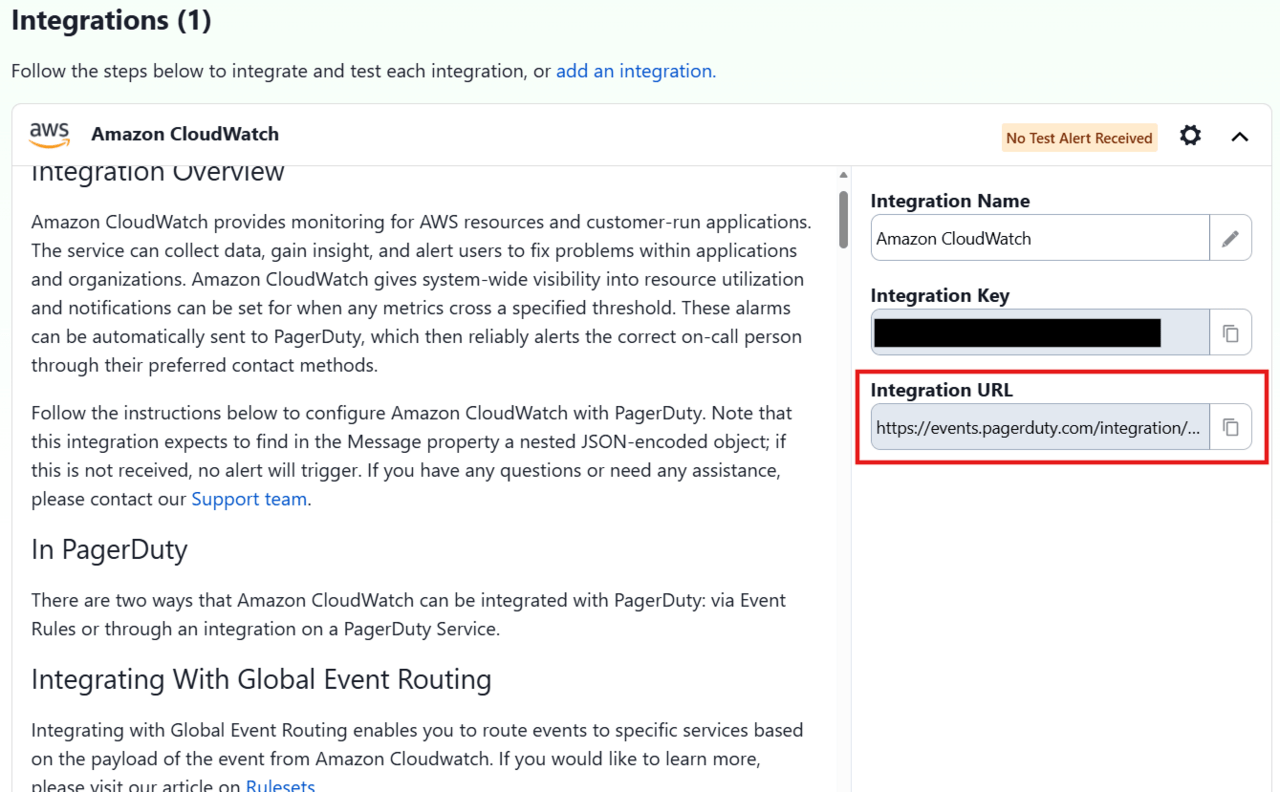 サービス作成後に表示される画面で、Integration URLhttps://events.pagerduty.com/integration/xxxxxxxx...)をコピーしておきます。このURLがAWS側からの通知先となります。
