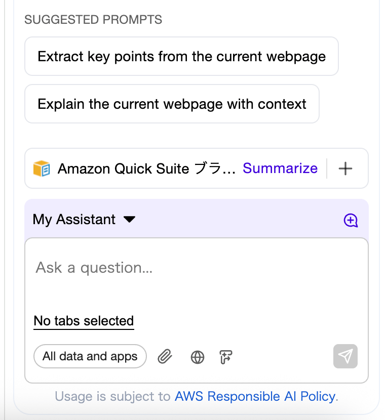 ChromeやFirefoxのブラウザ内でQuick Suiteと対話することができます。
