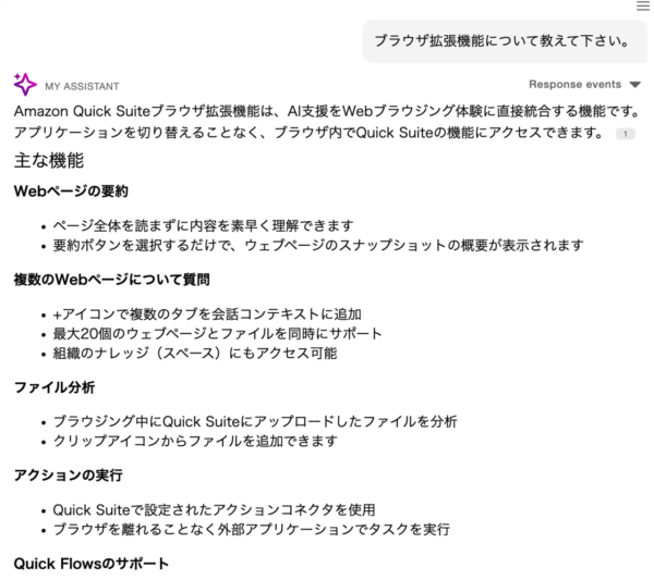 ざっくり言うと「ブラウザの中で、そのままAIアシスト(要約・Q&A・社内ナレッジ参照・アクション実行・ファイル分析)ができ、その拡張機能がQuick Flowsでもサポート可能になった」とのこと。