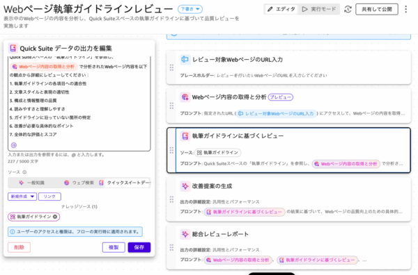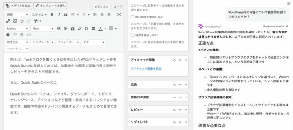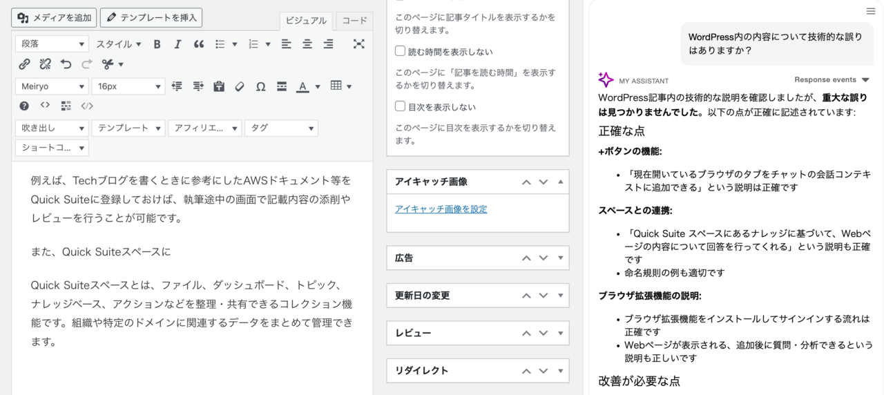 例えば、Techブログを書くとき参考にしたAWSドキュメント等を+ボタンでQuick Suiteに登録しておけば、ブログ執筆途中の画面で記載内容の添削やレビューを行うことが可能となります。(今この記事を執筆に使ってみましたが、とても便利です)