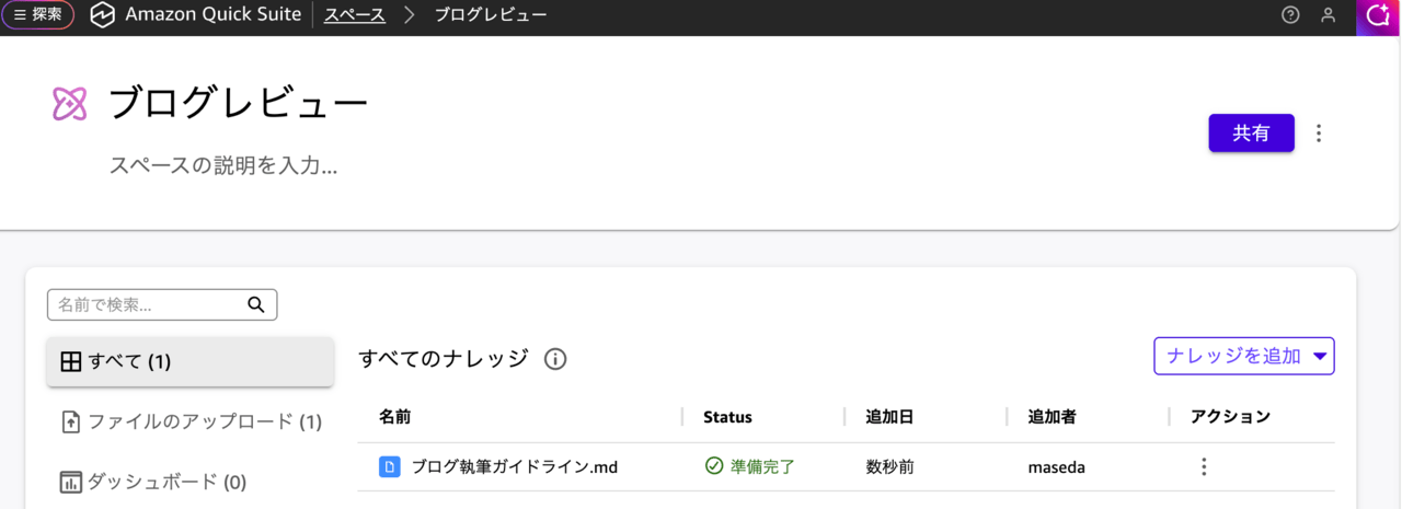 まず、Quick Suiteのスペースに「ブログ執筆ガイドライン」を格納します。