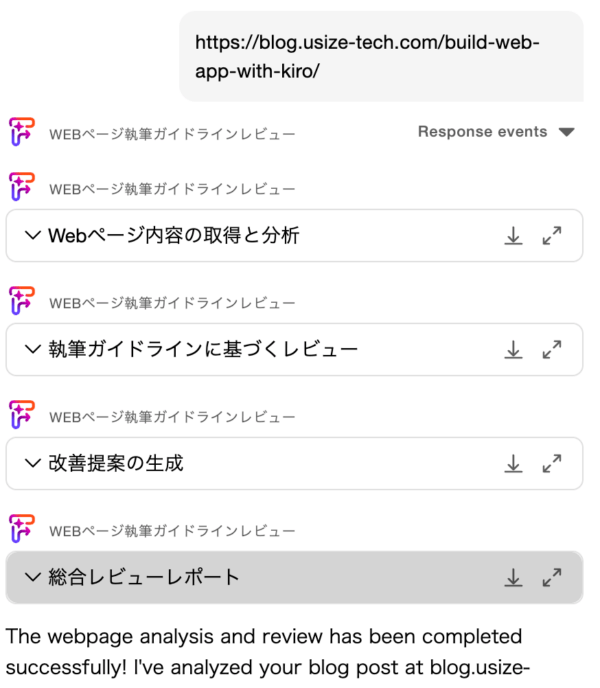 さっそくワークフローを実行して、過去の私の記事をレビューしてもらいました。