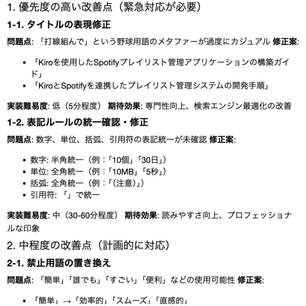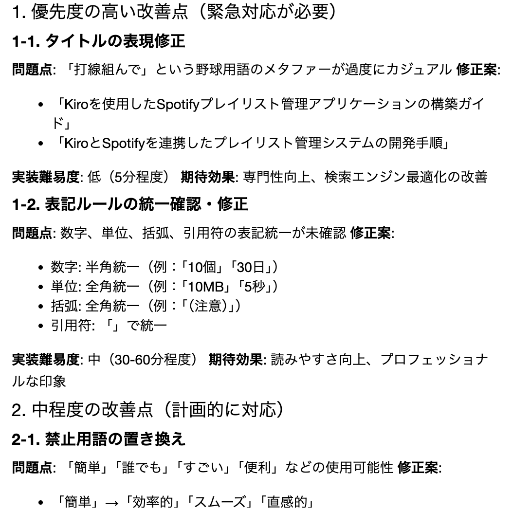 # ブログ執筆ガイドライン ## 文体・トーン * 文体: です・ます調で統一 * トーン: 親しみやすく、かつ専門的 * 一人称: 「私」または「筆者」 ## 表記ルール * 製品名・サービス名は正確であること * 半角数字を使用すること: 「3つ」「20個」 * 単位は全角: 「10MB」「30日間」 * 括弧: 全角()を使用 * 引用符: 「」を使用(""は避ける) * 中黒: ・を使用 ## 禁止用語・推奨表現 * 過度にカジュアルな表現は用いない(「めっちゃ」「ヤバい」など) * 曖昧な表現は用いない(「たぶん」「かもしれない」など) * 禁止用語 - 「簡単」→ 「シンプル」「わかりやすい」を使用 - 「誰でも」→ 「技術的な知識がなくても」など具体的に - 「すごい」→ 「強力な」「効果的な」など具体的に - 「便利」→ 具体的なメリットを記述