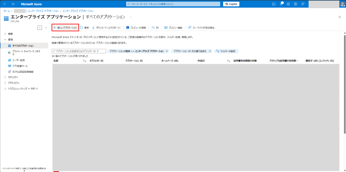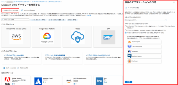 Azure管理コンソールでEntra IDの画面を開き、エンタープライズアプリケーションを新規作成します。