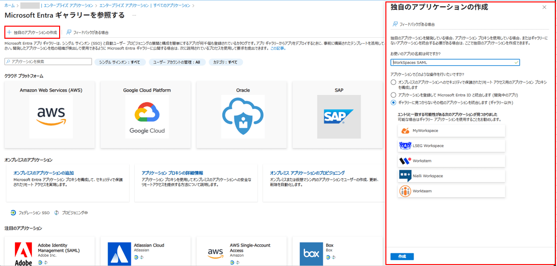 まずはEntra IDにSAML認証用のエンタープライズアプリケーションを追加していきます。