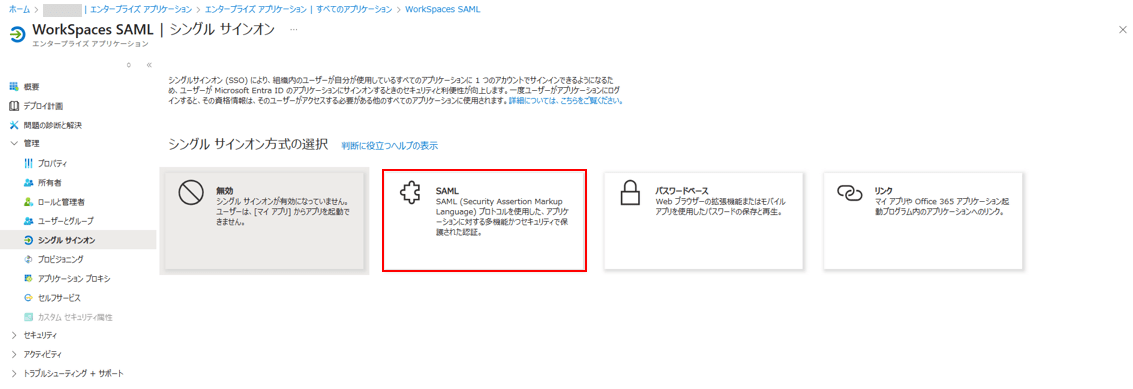 エンタープライズアプリケーションの作成が完了したら、作成したアプリケーションの「シングルサインオン」画面を開きます。