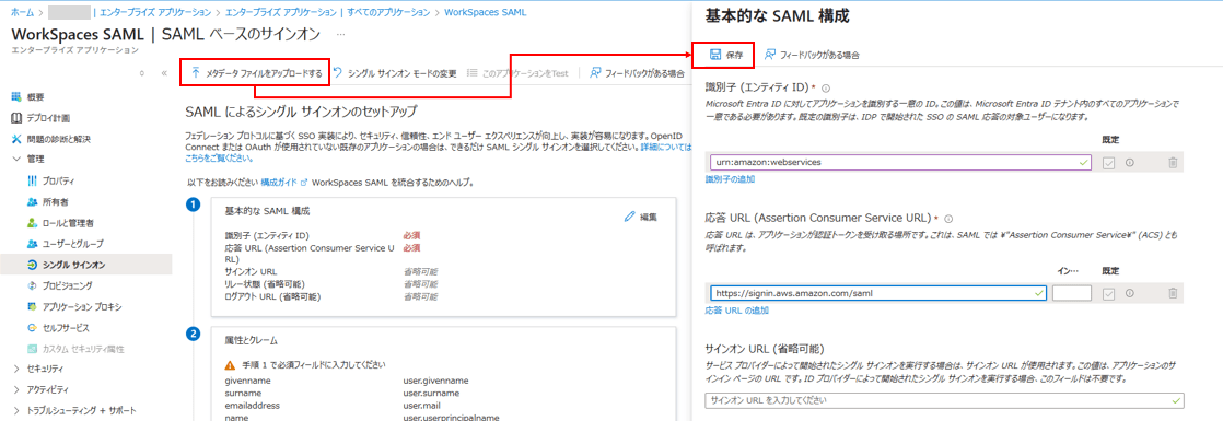 ダウンロードしたメタデータXMLをアップロードして、「保存」を押下します。
