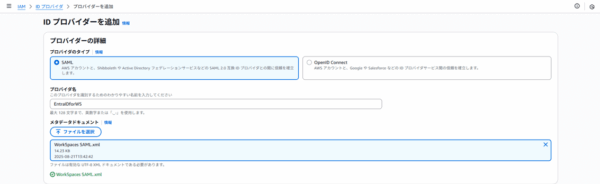 ここでダウンロードしたXMLファイルを用いて、AWS側のIDプロバイダー設定を実施します。