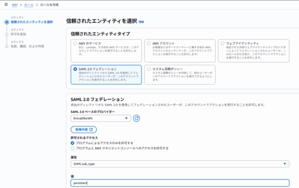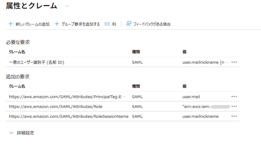 | https://aws.amazon.com/SAML/Attributes/Role | – (デフォルト) | ④で作成したロールのARN,③で作成したプロバイダのARN (arn:~,arn:~のようにカンマ区切りで記載する) |