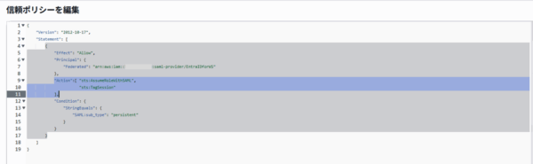 ロールが作成出来たら、ロールの信頼関係設定で、信頼ポリシーのActionに”sts:TagSession”を追加し、保存します。