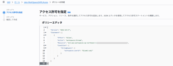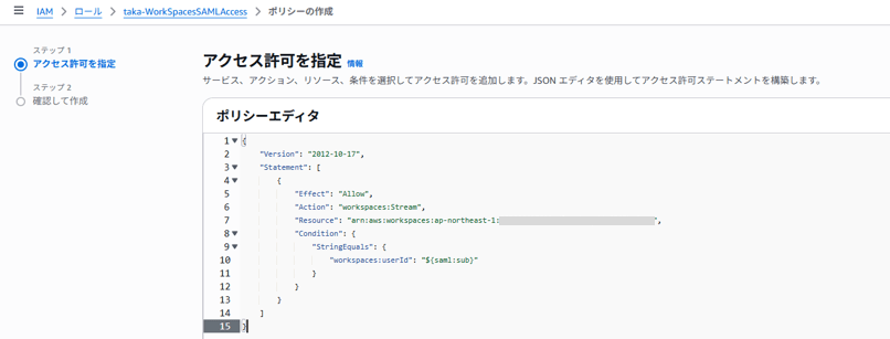 "Resource": "arn:aws:workspaces:<対象リージョン>:<対象AWSアカウントID>:directory/<WorkSpacesディレクトリID>",
