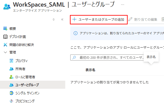 作成したアプリケーションの「ユーザーとグループ」画面を開き、「ユーザーまたはグループの追加」からWorkSpacesを利用するユーザー/グループを追加します。