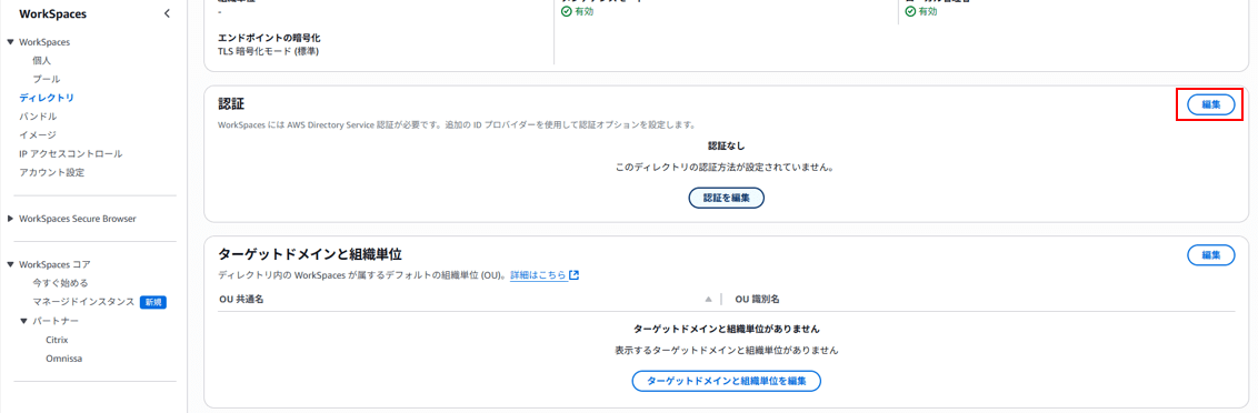 ディレクトリ画面が開いたら、認証設定を編集してきます。