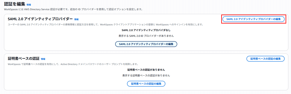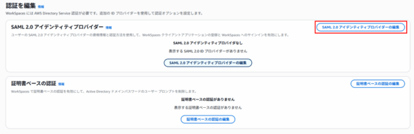 認証設定画面が開いたら、「SAML 2.0 アイデンティティプロバイダーの編集」を押下します。
