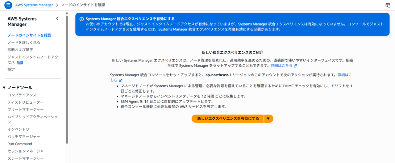 JITノードアクセスでは、Cedar言語で記述された承認ポリシーによってアクセス制御を行います。承認ポリシーの作成にはSystems Manager統合エクスペリエンスの有効化が必要です。Systems Managerコンソールを開き、画面上部に「新しいエクスペリエンスを有効にする」バナーが表示されている場合はクリックして有効化してください。