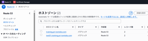 Route53でホストゾーン test01.training.pri-tomioka.com を作成して、