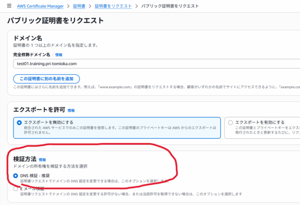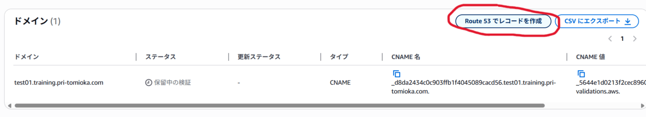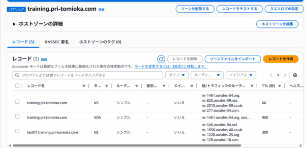 - 親ドメインpri-tomioka.comにNSレコード作成し、サブドメイン(共通ホストゾーン)training.pri-tomioka.comのネームサーバを指定
