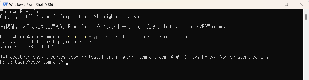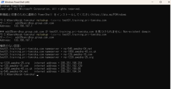 nslookupを実行すると、NSレコードがDNSに登録されていることを確認できました。