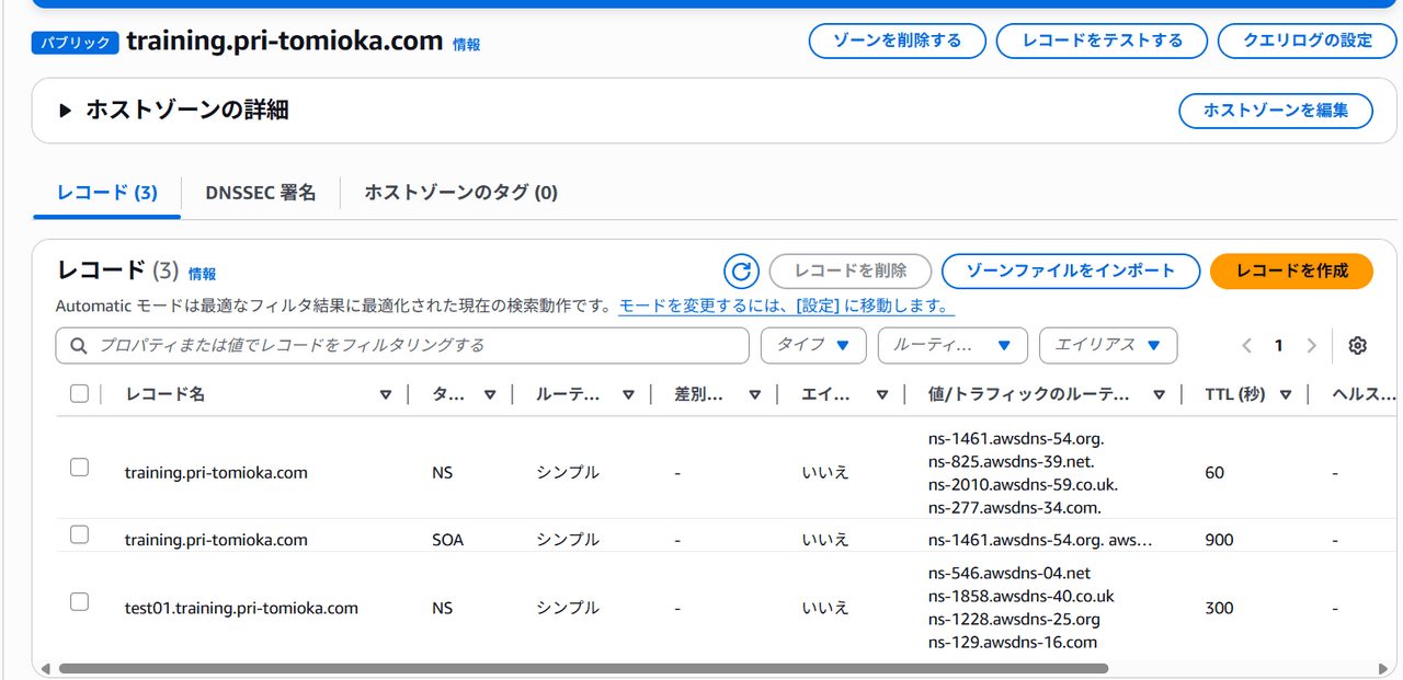 - 共通ホストゾーンtraining.pri-tomioka.comにNSレコード作成し、サブドメインtest01.training.pri-tomioka.comのネームサーバを指定