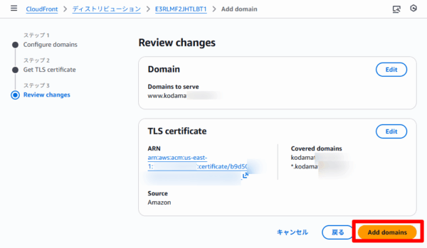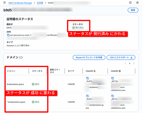 しばらくすると、Certificate Manager の証明書のステータスが「発行済み」に、ドメインのステータスが 「成功」 に変わります。