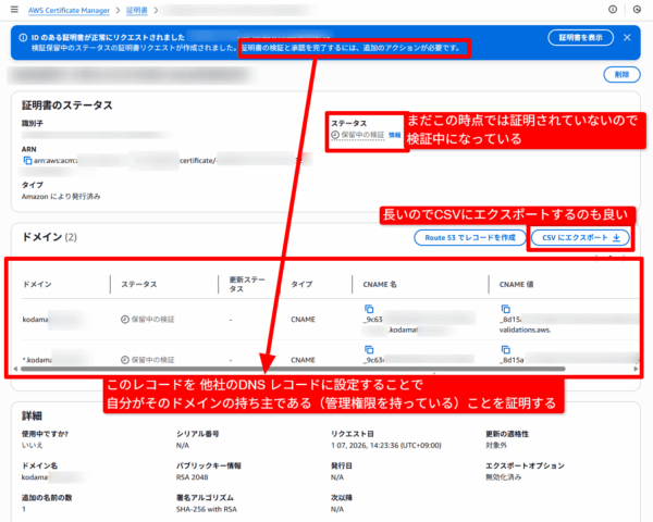 ドメインの正当な持ち主であることを証明するために、 証明書をリクエストしたドメインのDNSの 指定された CNAME名 に指定された CNAME値 を設定する必要があります。