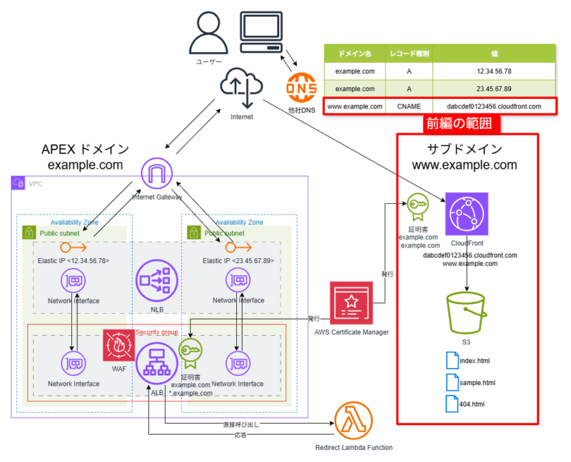 本番では本来のWebサイト( 例えば www.example.com ) に転送するのですが、今回は記事用の検証なので転送先ドメインが必要です。検証用に CloudFront – S3 の環境を作成します。下図の右側の赤枠の範囲になります。