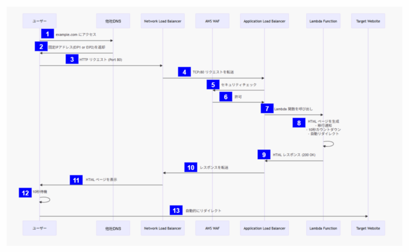 他社DNSでのAPEXドメインレコードに対する要件(IPアドレスを直接設定)を満たすために、Network Load Balancer(NLB) に Elastic IP を付与し、Webサイトとして必要な証明書は Application Load Balancer(ALB) で行い、サブドメインに対するリダイレクト処理を行うHTML応答を Lambda関数内で生成、レスポンスとして返却することで、ブラウザにサブドメインへリダイレクトするよう促します。