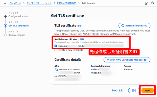 検証用リダイレクト先サイトに ACM 証明書を設定