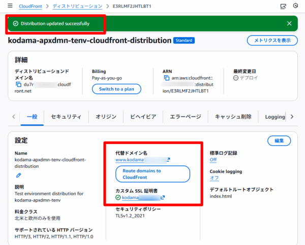 Distribution updated successfully と表示され、代替ドメイン名に www.example.com 、カスタムSSL証明書の欄がチェックマークになっていればOKです。
